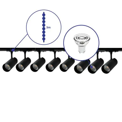 Descrizione Bright Choice Set completo 1-Fase Rail 3 Metro Nero | incl. 8x Faretti + GU10 2700K 3W Dimmerabile + Tappo Di Chiusura, Connettore di Alimentazione e I-Connettore