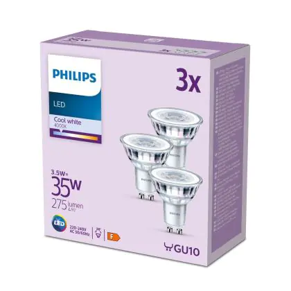 | Nome del fabbricante | Box 3 stuks - Philips LED Spot - 35 W - GU10 - Koelwit licht | |