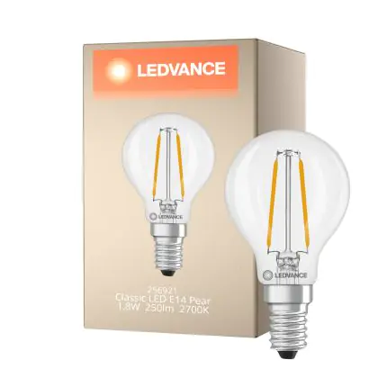 La lampada Ledvance Classic LED E14 Pera Filamento Chiara 1.8W 250lm - 827 Bianco Molto Caldo | Sostitutiva 25W è il sostituto perfetto per le tue vecchie lampade 25W con attacco a vite piccolo E14 grazie alla sua tecnologia LED. Passare a LED ti offrirà molti vantaggi!