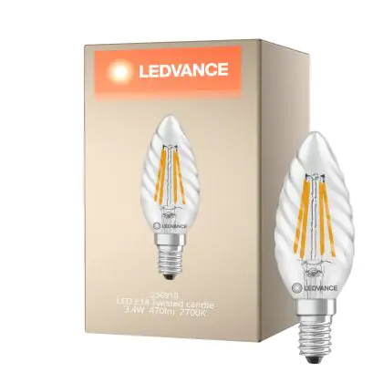La lampada Ledvance Classic LED E14 TWisted Candela Filamento Chiara 3.4W 470lm - 827 Bianco Molto Caldo | Sostitutiva 40W è il sostituto perfetto per le tue vecchie lampade 40W con attacco a vite piccolo E14 grazie alla sua tecnologia LED. Passare a LED ti offrirà molti vantaggi!