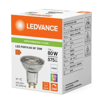 La Ledvance LED PAR16 GU10 Riflettore 7W 575lm 36D - 940 Bianco Freddo | Miglior Resa Cromatica - Dimmerabile - Sostitutiva 80W è perfetta per la sostituzione della convenzionale Lampada alogena 80W GU10 con colore della luce 940 Bianco Freddo. Questa Lampada ha una forma Riflettore con un diametro di 50mm. I due perni sono distanti tra loro 10mm. Questa lampada funziona con la 220V-230V e quindi non ha bisogno di trasformatori. Passare a LED ti offrirà molti vantaggi!