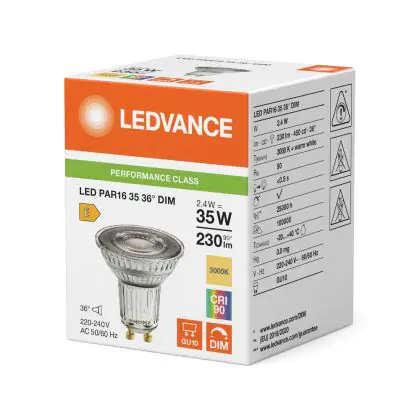 La Ledvance LED Riflettore GU10 PAR16 2.4W 230lm 36d - 930 Luce Calda - Luce Calda - | Dimmerabile - Sostitutiva 35W è perfetta per la sostituzione della convenzionale Lampada alogena 35W GU10 con colore della luce . Questa Lampada ha una forma Riflettore con un diametro di 50mm. I due perni sono distanti tra loro 10mm. Questa lampada funziona con la 220V-230V e quindi non ha bisogno di trasformatori. Passare a LED ti offrirà molti vantaggi!