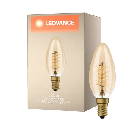 La lampada Ledvance Vintage 1906 LED E14 Candela Oro 3.4W 250lm - 822 Bianco Molto Caldo | Dimmerabile - Sostitua 25W è il sostituto perfetto per le tue vecchie lampade 25W con attacco a vite piccolo E14 grazie alla sua tecnologia LED. Passare a LED ti offrirà molti vantaggi!