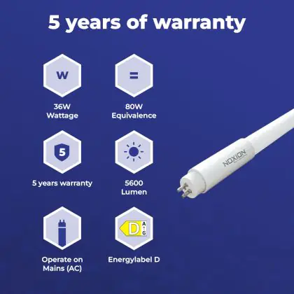 Il Noxion Avant LEDtube T5 Avant Extreme (Mains AC) High Output 36W 5600lm - 840 Bianco Freddo | 145cm - Sostitutiva 80W è un tubo LED perfetto per sostituire gli standard tubi fluorescenti di 80 W. Con questo tubo LED di Noxion ti assicuri una lunga durata e 5 anni di garanzia.