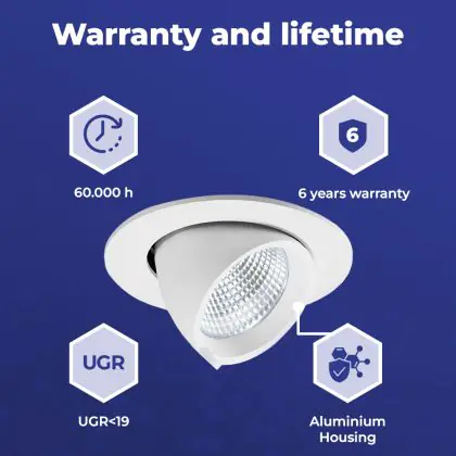 I LED sono famosi per durare a lungo e di emettere fino alla fine una luce intensa e priva di sfarfallii, cosa che riduce molto i costi di manutenzione e sostituzione. Questo downlight ha un ciclo di vita di circa 60000 ore. Inoltre questo articolo è protetto dalla nostra garanzia totale di 6 anni. Cosa aspetti? Passa al LED!