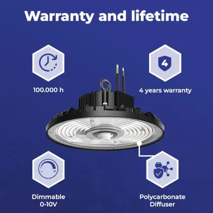 La tecnologia LED è la scelta giusta sia dal punto di vista ambientale che economico, infatti questa lampada industriale LED ha una potenza luminosa di 32000 lumen e consuma 200 watt, che può arrivare ad essere fino al 70% in meno rispetto ad altri apparecchi con tecnologie diverse. Inoltre, i LED non sostengono sostanze nocive e alla fine del loro ciclo di vita di circa 100000 ore possono essere riciclati! Questa lampada è protetta da una garanzia di 4 anni.