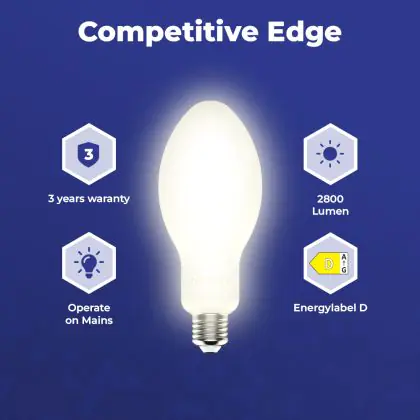Questa lampadina LED HPL di Noxion è stata create specialmente per sostituire la lampade a scarica convenzionali, che sono andate fuori produzione per via dell'elevato consumo di energia e per la presenza di mercurio. Questa nuova alternativa a LED ti farà risparmiare fino al 75% di energia e non contiene né mercurio né altri materiali dannosi per l’ambiente. Inoltre i LED si possono riciclare.