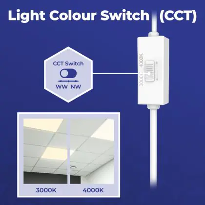 Per quanto riguarda il colore della luce, ci sono diverse opzioni fra cui scegliere, ognuna con una diversa applicazione. Una luce di 3000K (bianco caldo) è particolarmente adatta alle aree generali, mentre la luce di 4000K (bianco freddo) favorisce la concentrazione e l'attenzione e quella di 6500K (bianco luce del giorno) è l'opzione migliore per i luoghi in cui serve avere una buona visibilità dei dettagli. Questo particolare apparecchio ha temperatura di colore di 3000K - 4000K CCT.