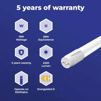 Il Noxion Tubo LED T8 Avant (EM/Mains) Standard Output 19W 2300lm - 840 Bianco Freddo | 150cm - Sostitutiva 58W è l’alternativa perfetta per il tubo fluorescente standard 58W nelle plafoniere con un reattore. Con questo tubo LED hai una garanzia di una vita media utile molto lunga e 5 anni Lampadadiretta.it di totale garanzia. .
