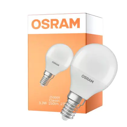 La lampada Osram Classic LED E14 Sferica Ghiaccio 3.3W 250lm - 827 Bianco Molto Caldo | Sostitutiva 25W è il sostituto perfetto per le tue vecchie lampade 25W con attacco a vite piccolo E14 grazie alla sua tecnologia LED. Passare a LED ti offrirà molti vantaggi!