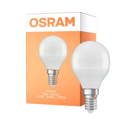 La lampada Osram LED Star Classic E14 Sferica Ghiaccio 3.3W 250lm - 827 Bianco Molto Caldo | Sostitutiva 25W è il sostituto perfetto per le tue vecchie lampade 25W con attacco a vite piccolo E14 grazie alla sua tecnologia LED. Passare a LED ti offrirà molti vantaggi!