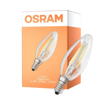 La lampada Osram LED Superstar Classic E14 Candela Filamento Chiara 2.2W 300lm - 927 Bianco Molto Caldo | Dimmerabile - Sostitutiva 25W è il sostituto perfetto per le tue vecchie lampade 25W con attacco a vite piccolo E14 grazie alla sua tecnologia LED. Passare a LED ti offrirà molti vantaggi!