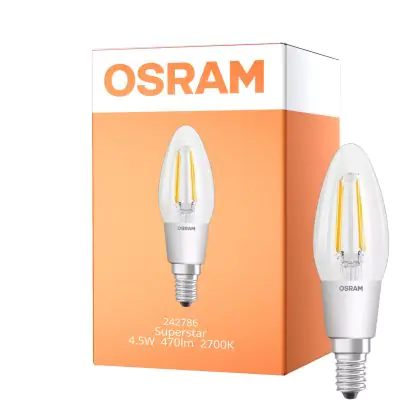 La lampada Osram Superstar Classic LED E14 Candela Filamento Chiara 4W 470lm - 822-827 Dim To Warm | Dimmerabile - Sostitutiva 40W è il sostituto perfetto per le tue vecchie lampade 40W con attacco a vite piccolo E14 grazie alla sua tecnologia LED. Passare a LED ti offrirà molti vantaggi!