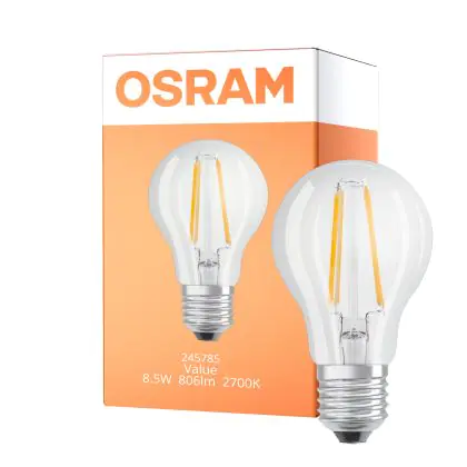 La Osram Value Classic LED E27 Pera Filamento Chiara 8.5W 806lm - 827 Bianco Molto Caldo | Dimmerabile è la perfetta sostituzione per la tua lampada convenzionale 60W con attacco E27 grazie alla sua tecnologia LED. Passare a LED ti offrirà tanti vantaggi!