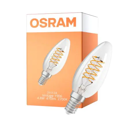 La lampada Osram Vintage 1906 LED Classic Slim E14 Candela Filamento Chiara 4.8W 470lm - 827 Bianco Molto Caldo | Dimmerabile - Sostitutiva 40W è il sostituto perfetto per le tue vecchie lampade 40W con attacco a vite piccolo E14 grazie alla sua tecnologia LED. Passare a LED ti offrirà molti vantaggi!