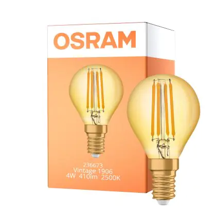 Descrizione Osram Vintage 1906 LED E14 Sferica Filamento Oro 4W 420lm - 825 Bianco Molto Caldo | Sostitutiva 35W