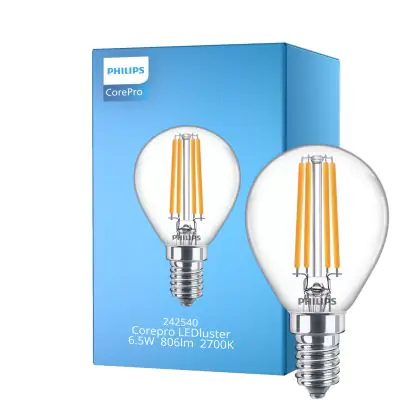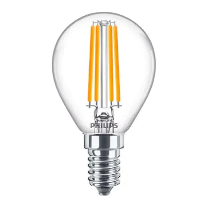La lampada Philips Corepro LED Lustre E14 Sferica Filamento Chiara 6.5W 806lm - 827 Bianco Molto Caldo | Sostitutiva 60W è il sostituto perfetto per le tue vecchie lampade 60W con attacco a vite piccolo E14 grazie alla sua tecnologia LED. Passare a LED ti offrirà molti vantaggi!