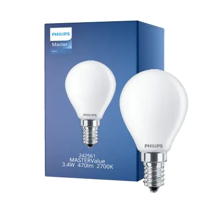 La lampada Philips Master Value LED Lustre E14 Sferica Ghiaccio 3.4W 470lm - 927 Bianco Molto Caldo | Miglior resa cromatica - Dimmerabile - Sostitutiva 40W è il sostituto perfetto per le tue vecchie lampade 40W con attacco a vite piccolo E14 grazie alla sua tecnologia LED. Passare a LED ti offrirà molti vantaggi!