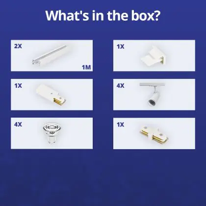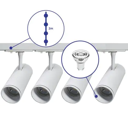 Descrizione Set completo 1-Fase Rail 2 Metro Bianca | incl. 4x Faretti + GU10 2700K 3W Dimmerabile + Tappo Di Chiusura, Connettore di Alimentazione e I-Connettore