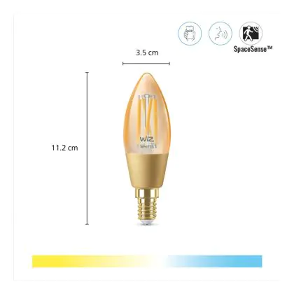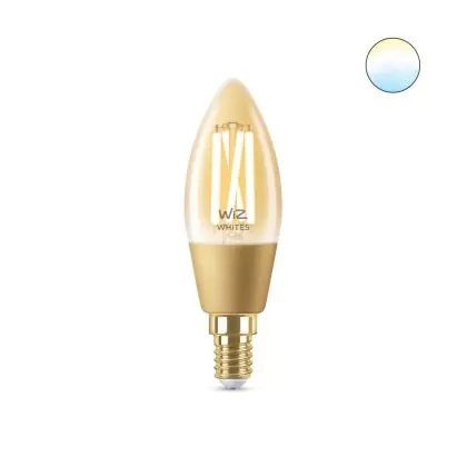 La lampada WiZ Smart LED E14 Candela Filamento Oro 5W 370lm | Miglior Resa Cromatica - Dimmerabile - Sostitutiva 25W è il sostituto perfetto per le tue vecchie lampade 25W con attacco a vite piccolo E14 grazie alla sua tecnologia LED. Passare a LED ti offrirà molti vantaggi!